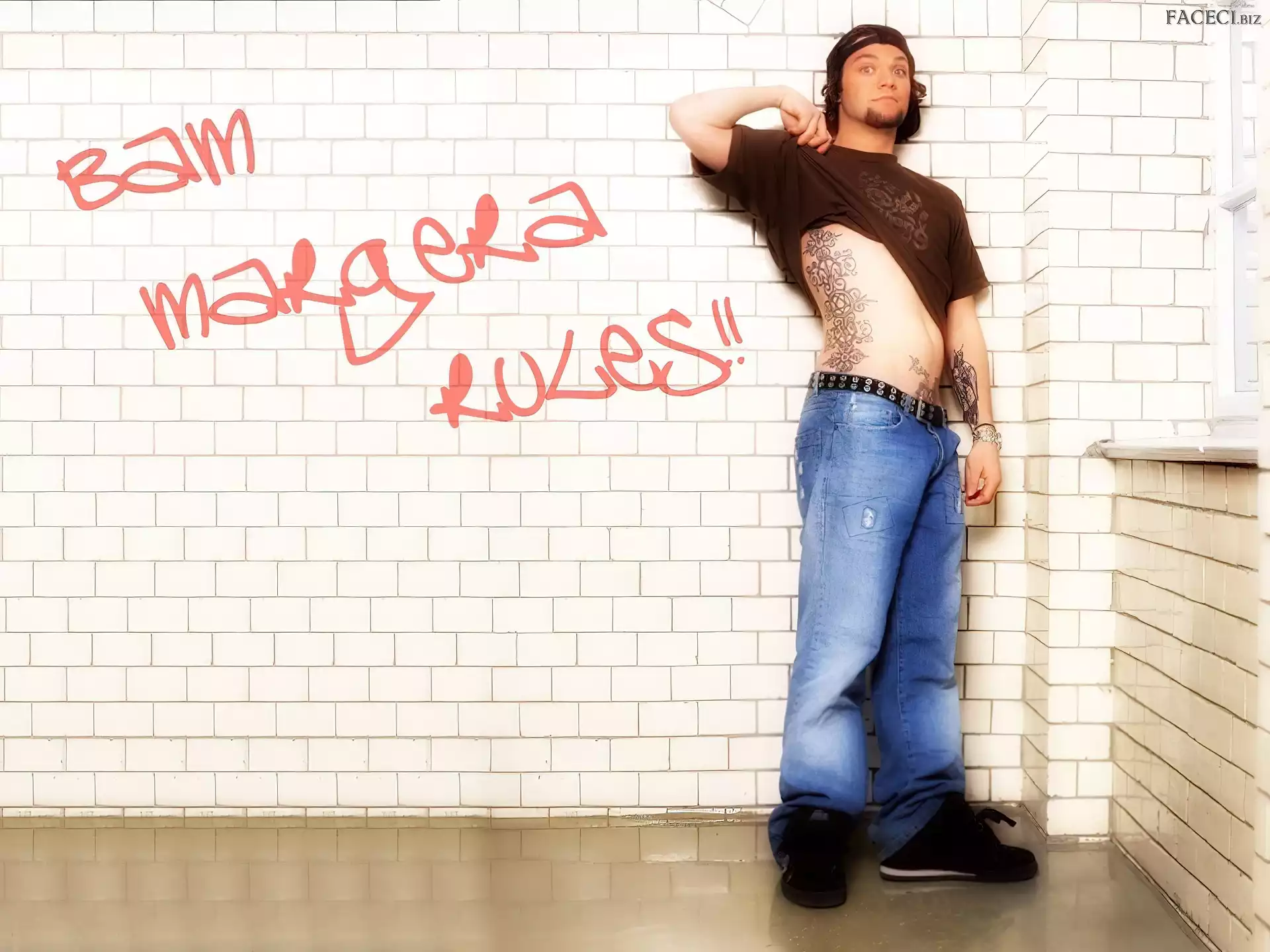 t-shirt, Bam Margera, brązowy okulary, Bam Margera, twarze kurtka, Bam Margera, rozpięta okulary, Bam Margera, butelka włosy, Bam Margera, ciemne zegarek, Bam Margera, deskorolka